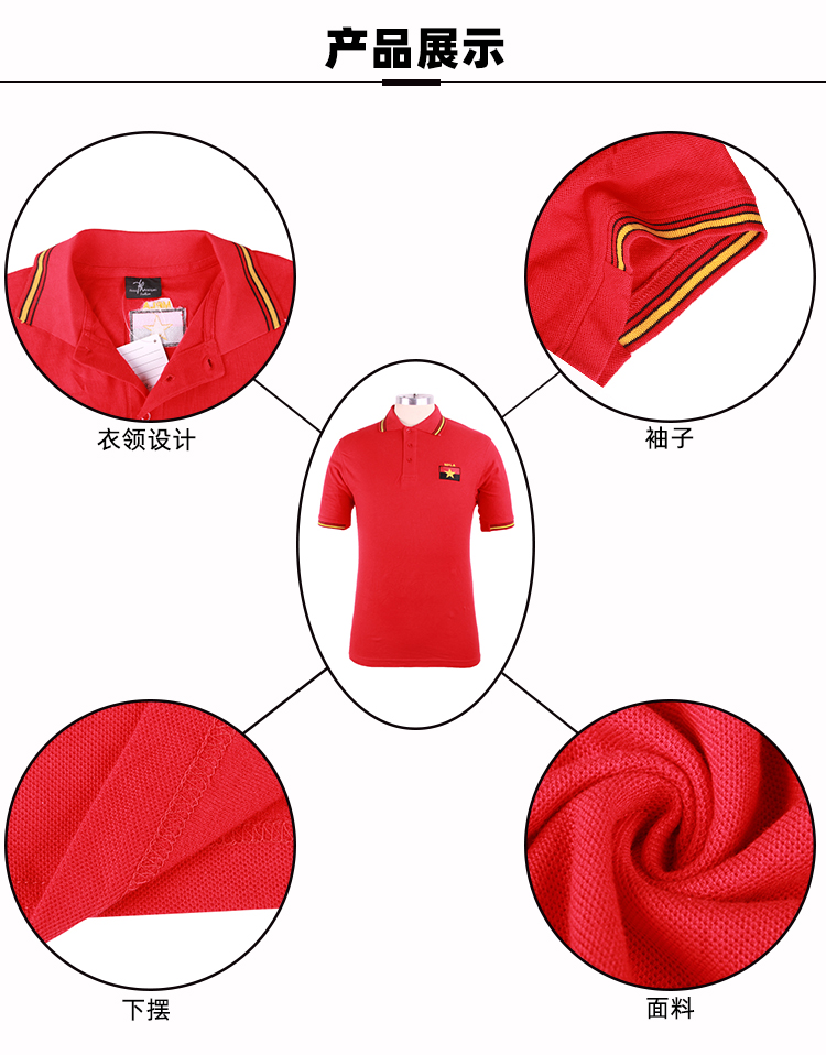 红色POLO衫,采用100%棉布料,耐磨抗皱不起球、吸湿保暖、天然亲肤、专业纸样,标准裁剪合体,定制特色条纹领和袖口,紧实饱满绣花/绣章。