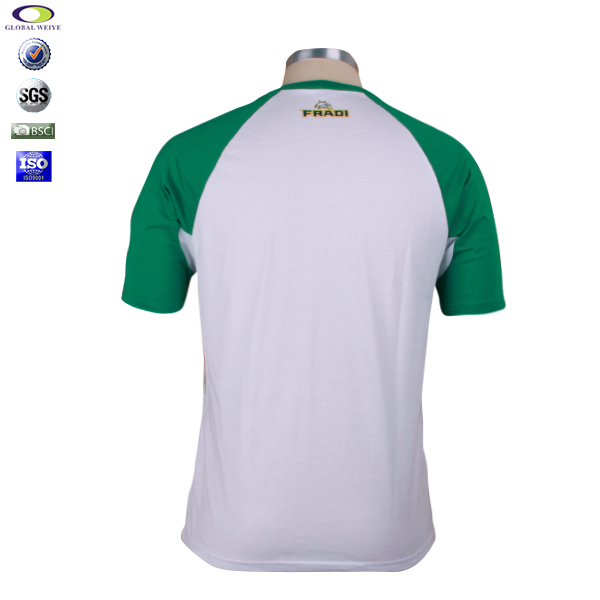 时尚男士V领T恤,采用高品质精梳棉面料,天然环保、柔软舒适、透气性好, 款式白色拼绿色撞色设计,棒球袖立体裁剪, 前幅精品刺绣logo