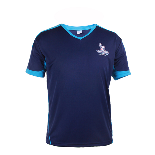 订制深蓝色全涤V领异色领印花T恤男短袖T恤衫运动服