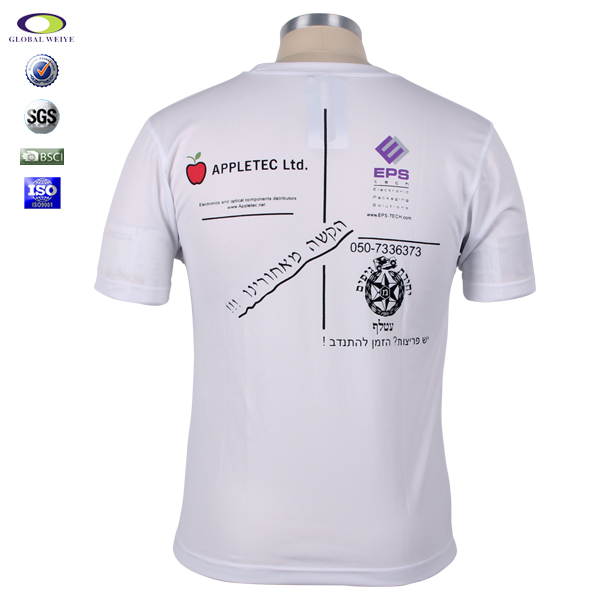 男士白色圆领全涤运动宣传印花短袖T恤衫,采用全涤速干面料,舒适耐穿,高性价比,经典款式 短袖圆领,前后幅高品质环保丝网印logo, 专业纸样 标准裁剪.
