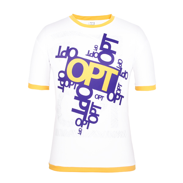 男士白色全涤异色领字母印花短袖T恤衫,采用全涤速干面料,舒适耐穿,高性价比, 白黄异色领撞色设计,前幅高品质环保丝网印logo 突显时尚魅力 专业纸样 标准裁剪,经典短袖时尚圆领款式。